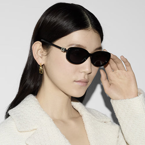 크리스탈 스퀘어 G 로고가 어우러진 스타일과 샤이니 블랙 프레임이 특징입니다.